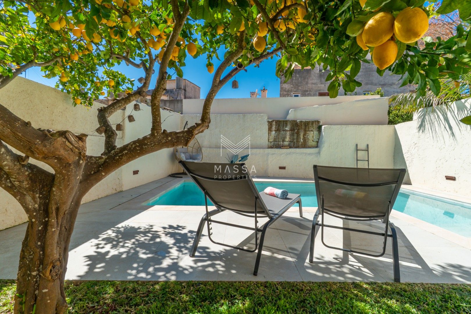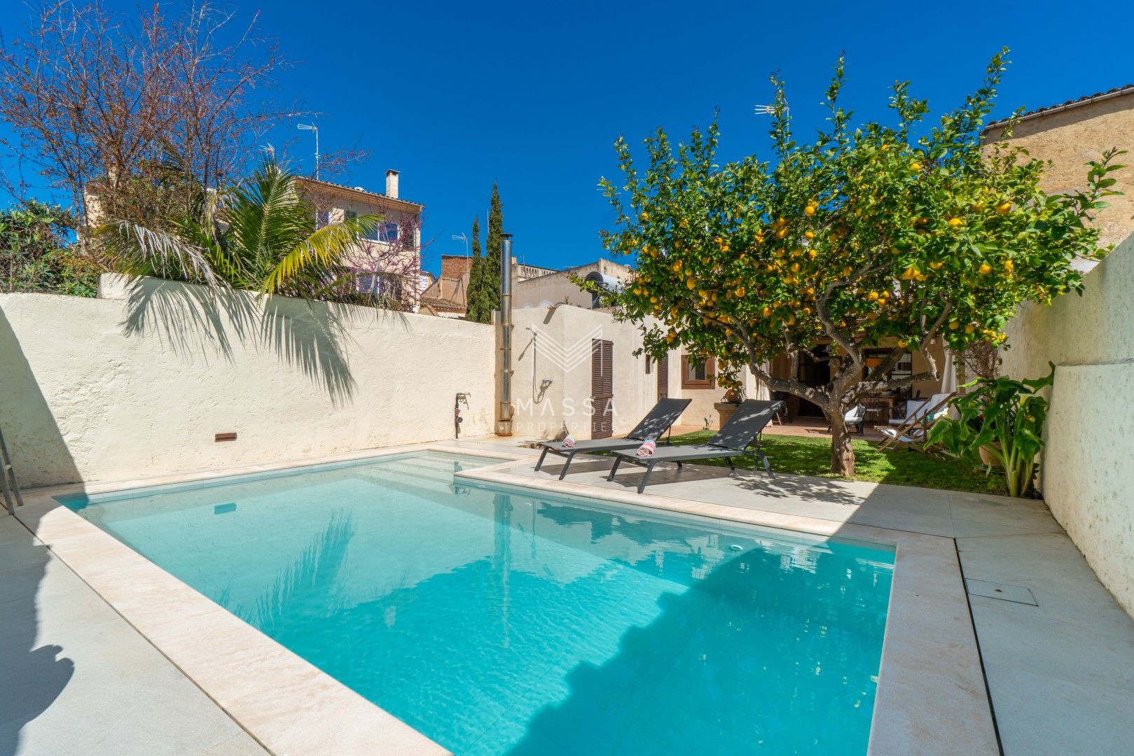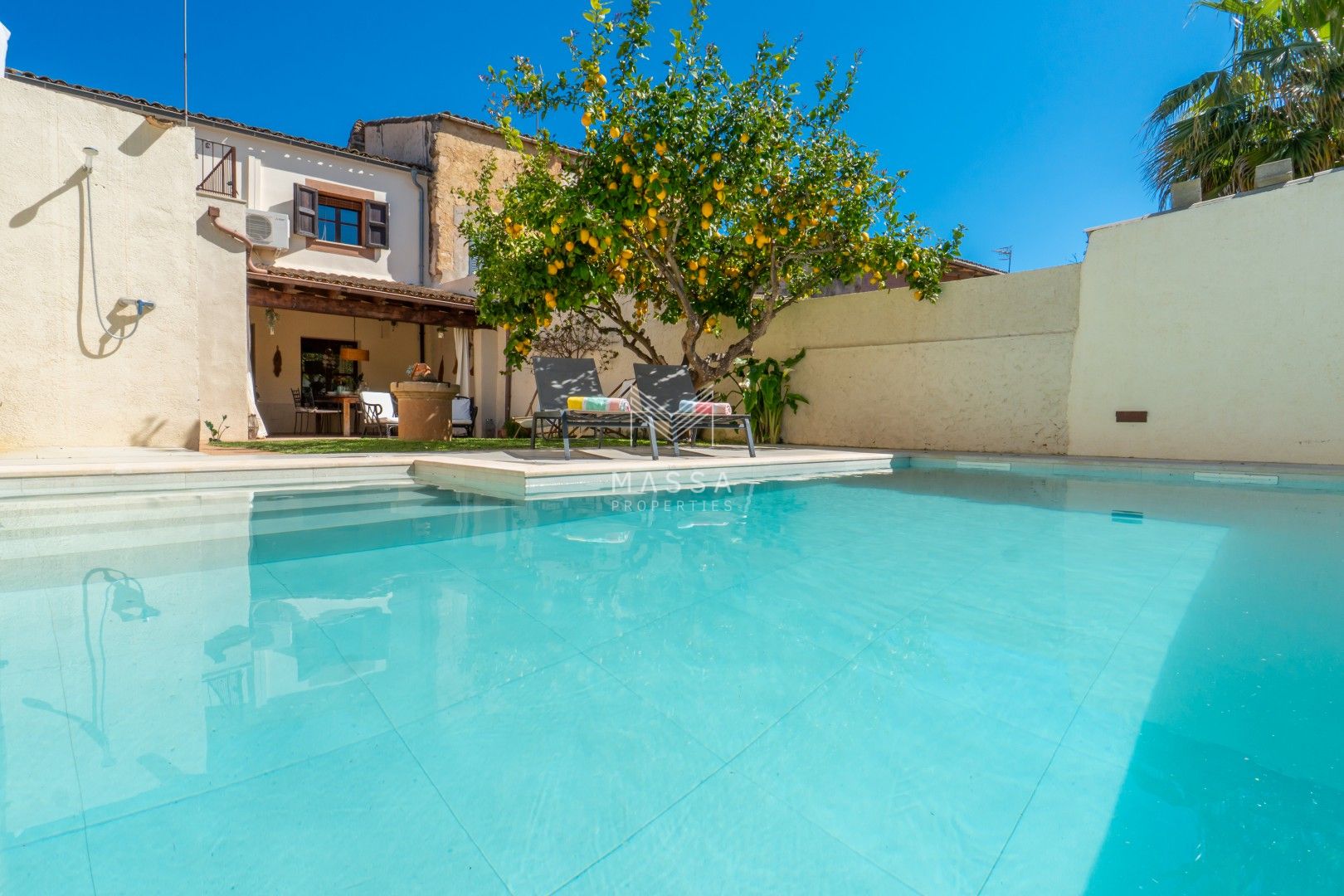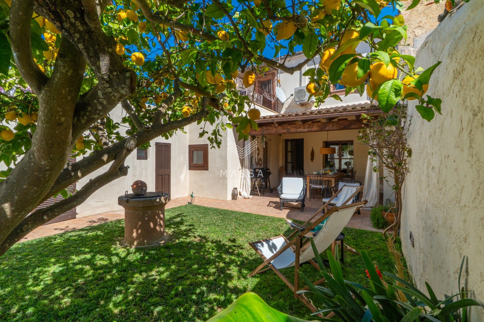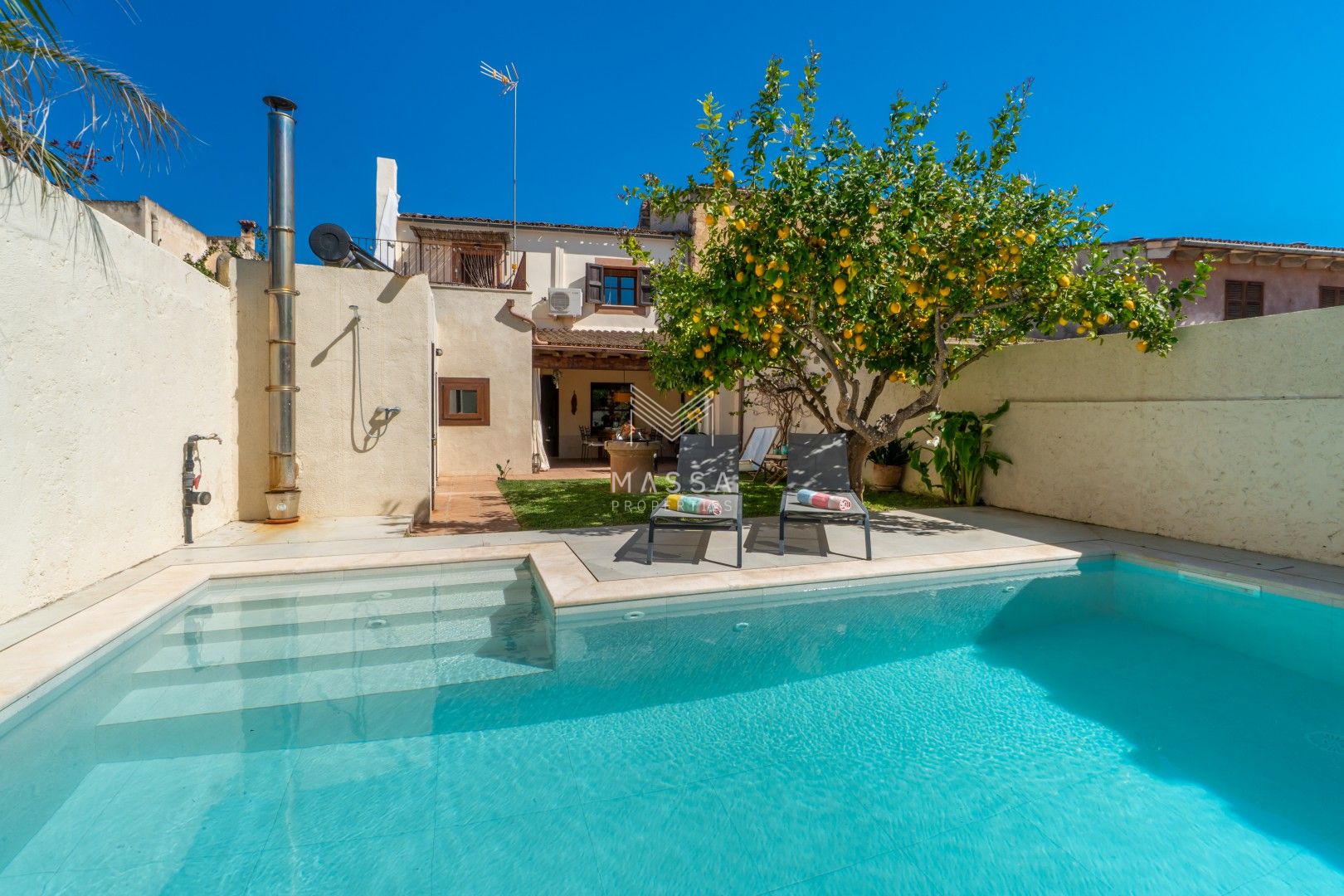 En el exterior, un cuidado jardín con piscina privada y ducha al aire libre invita a disfrutar del sol mallorquín, mientras que la terraza cubierta es perfecta para desayunos tranquilos o cenas al fresco. El emblemático limonero, que da nombre a la casa, aporta un encanto especial y auténtico. Para cerrar el día, nada mejor que contemplar la puesta de sol desde la azotea de la planta superior.