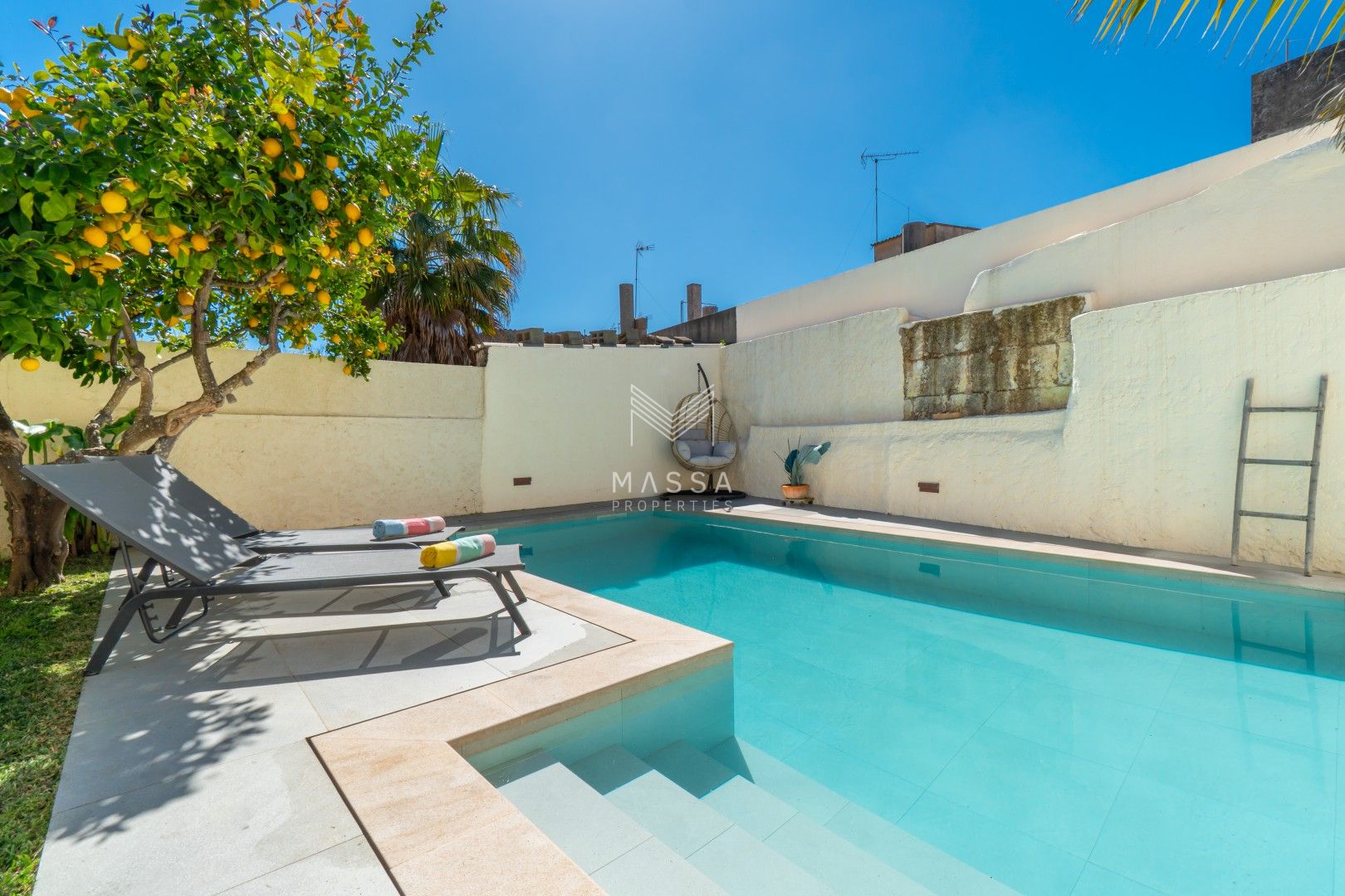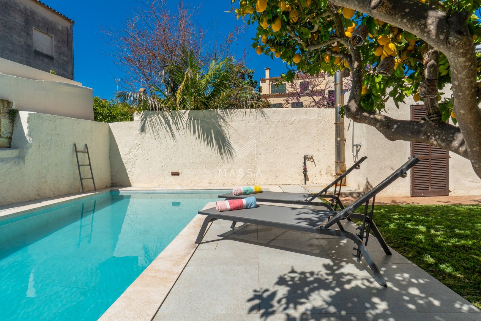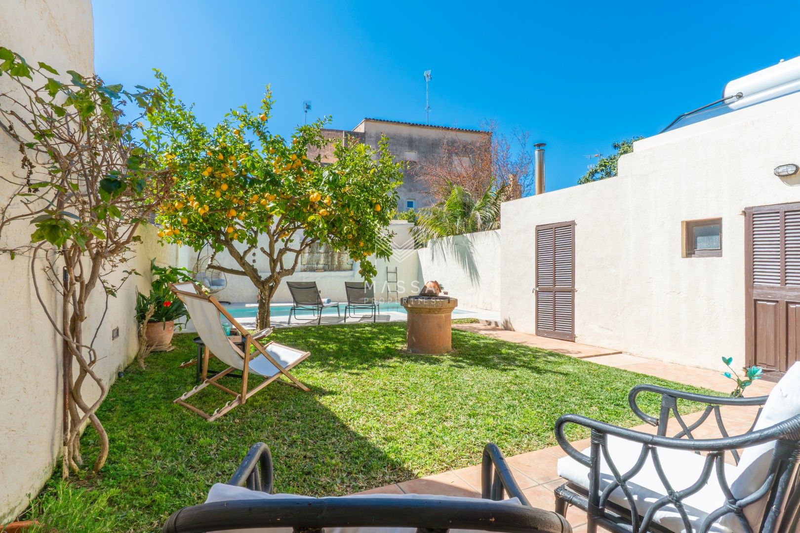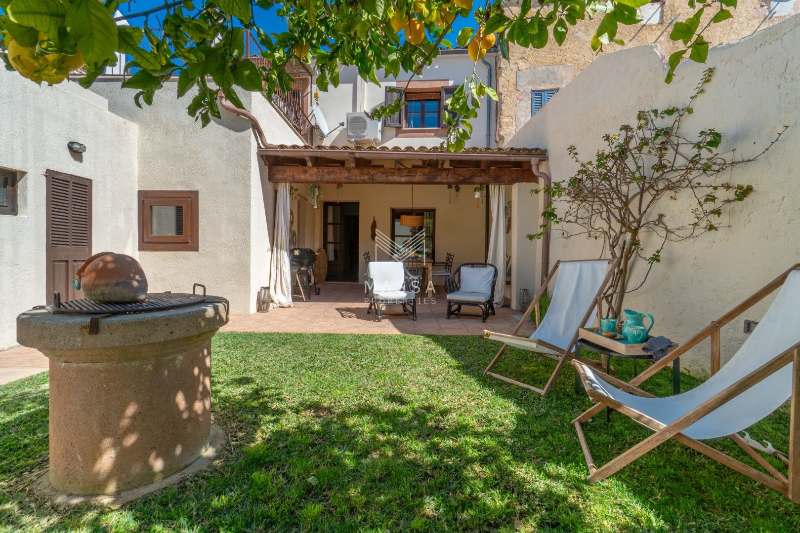 En el exterior, un cuidado jardín con piscina privada y ducha al aire libre invita a disfrutar del sol mallorquín, mientras que la terraza cubierta es perfecta para desayunos tranquilos o cenas al fresco. El emblemático limonero, que da nombre a la casa, aporta un encanto especial y auténtico. Para cerrar el día, nada mejor que contemplar la puesta de sol desde la azotea de la planta superior.