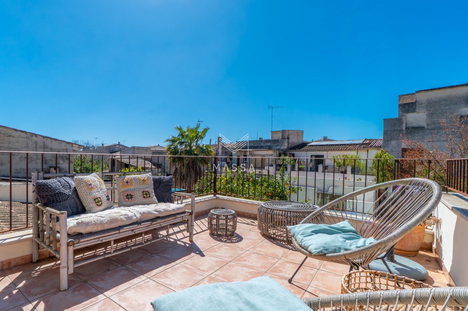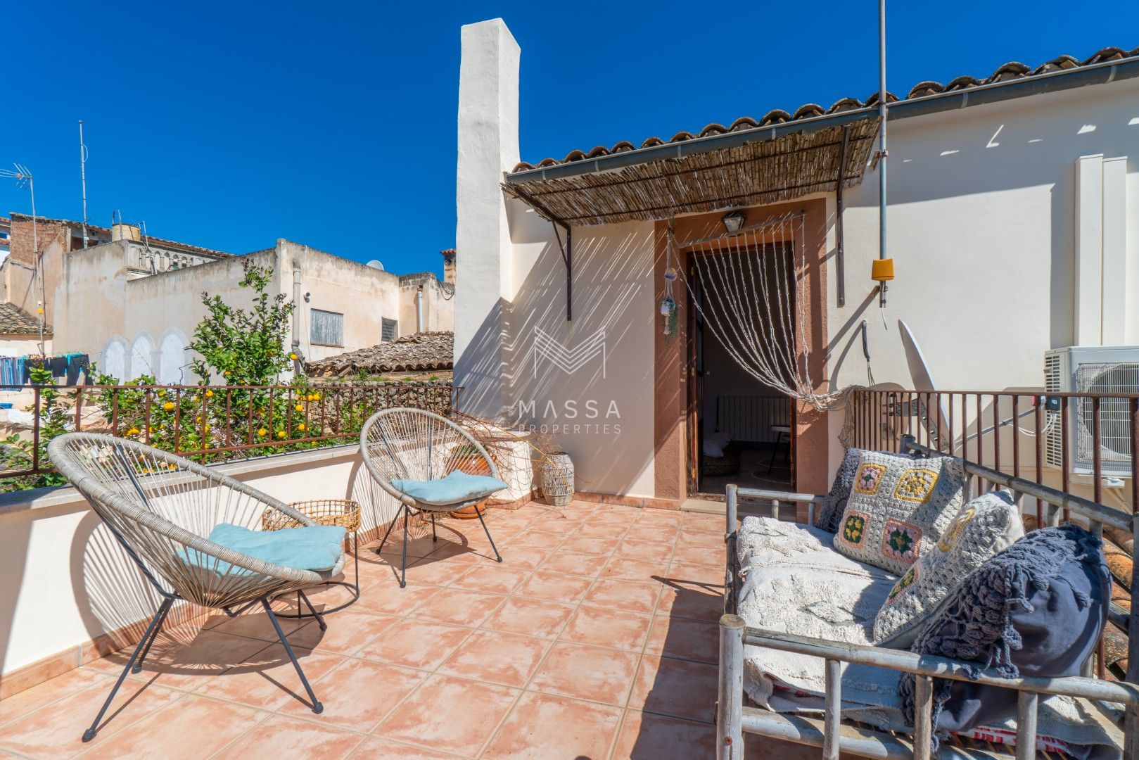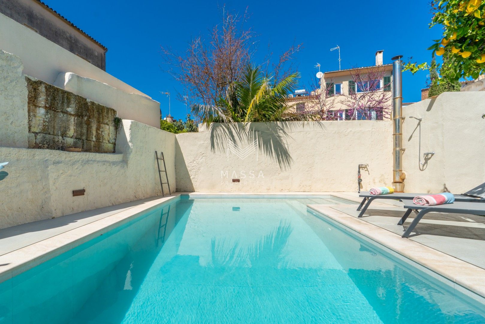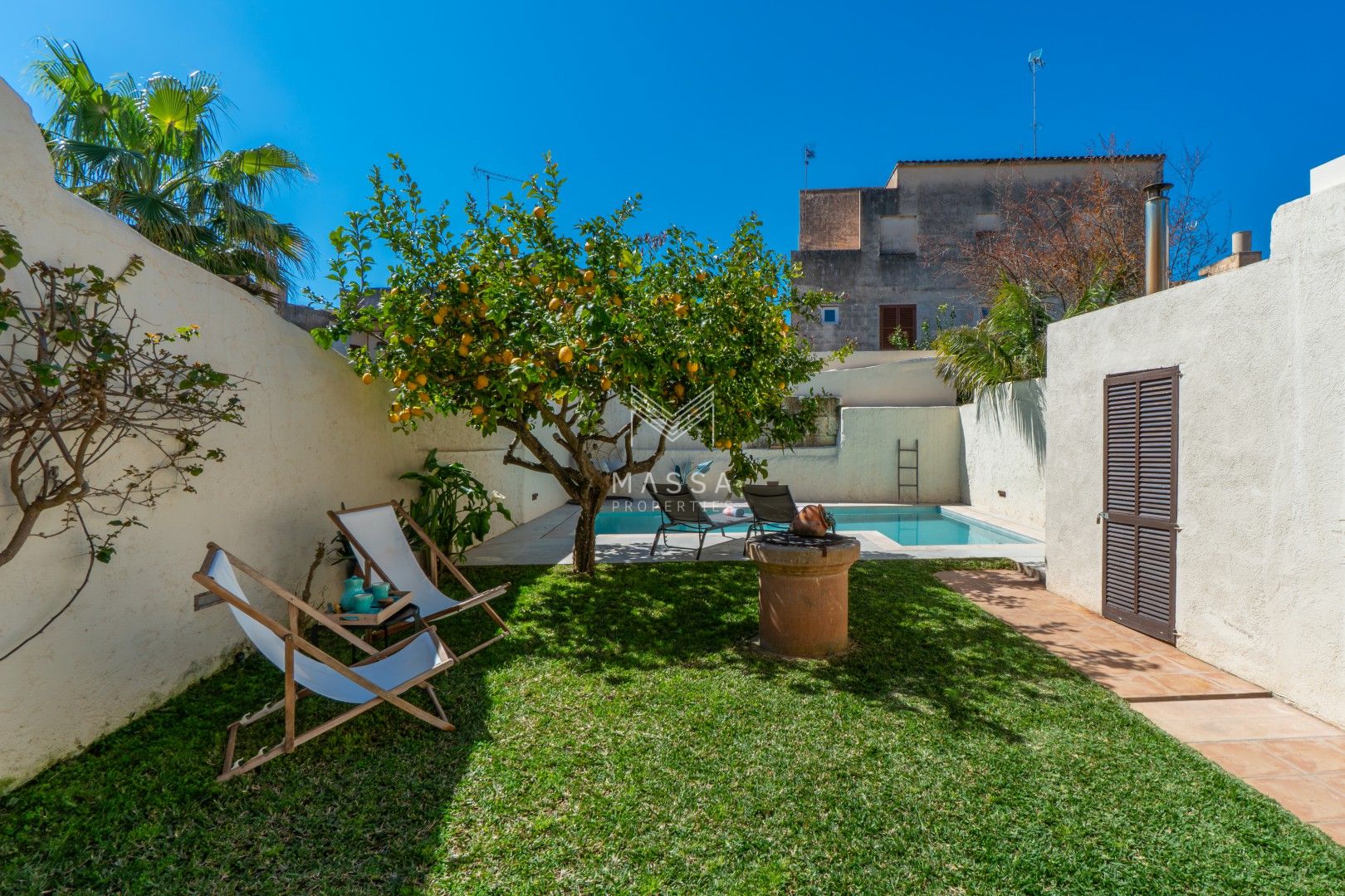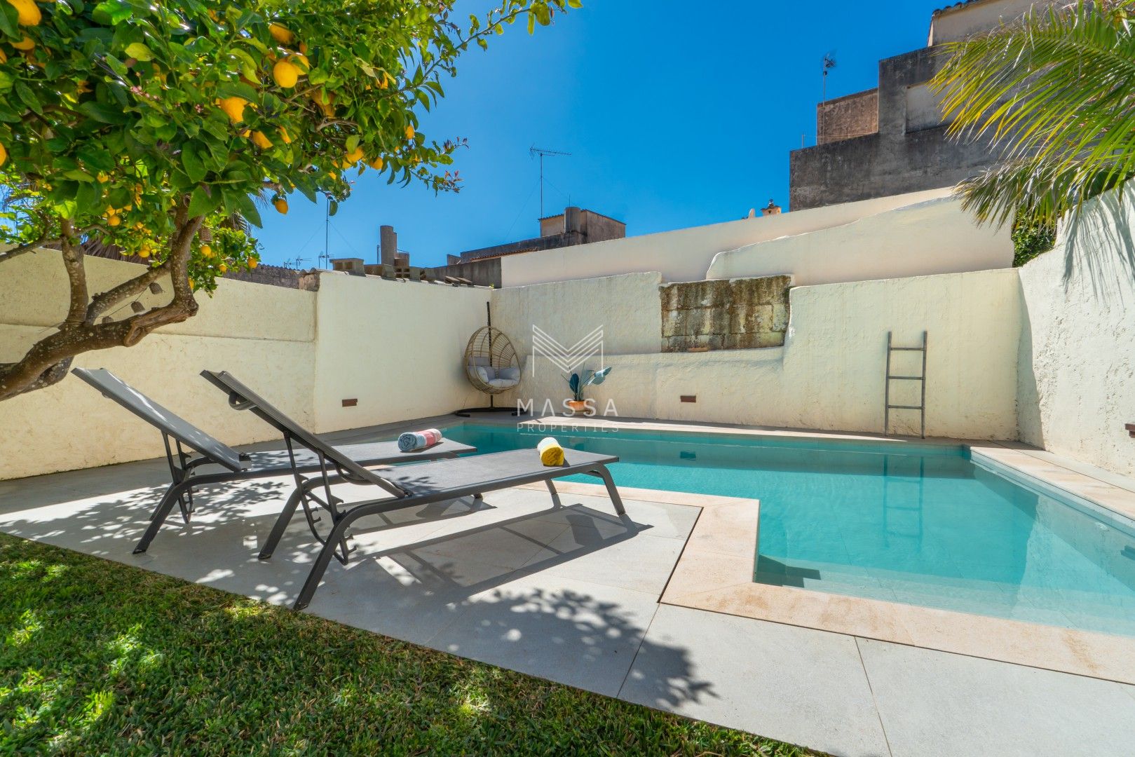 En el exterior, un cuidado jardín con piscina privada y ducha al aire libre invita a disfrutar del sol mallorquín, mientras que la terraza cubierta es perfecta para desayunos tranquilos o cenas al fresco. El emblemático limonero, que da nombre a la casa, aporta un encanto especial y auténtico. Para cerrar el día, nada mejor que contemplar la puesta de sol desde la azotea de la planta superior.