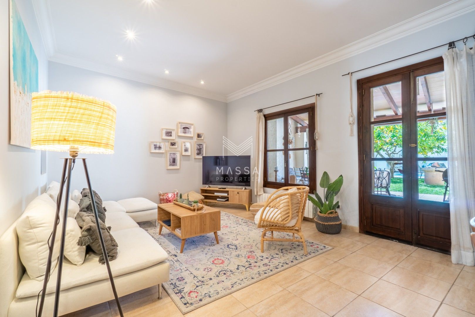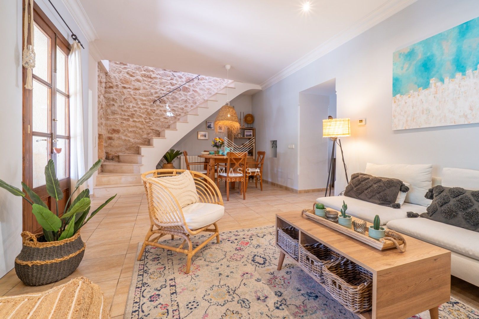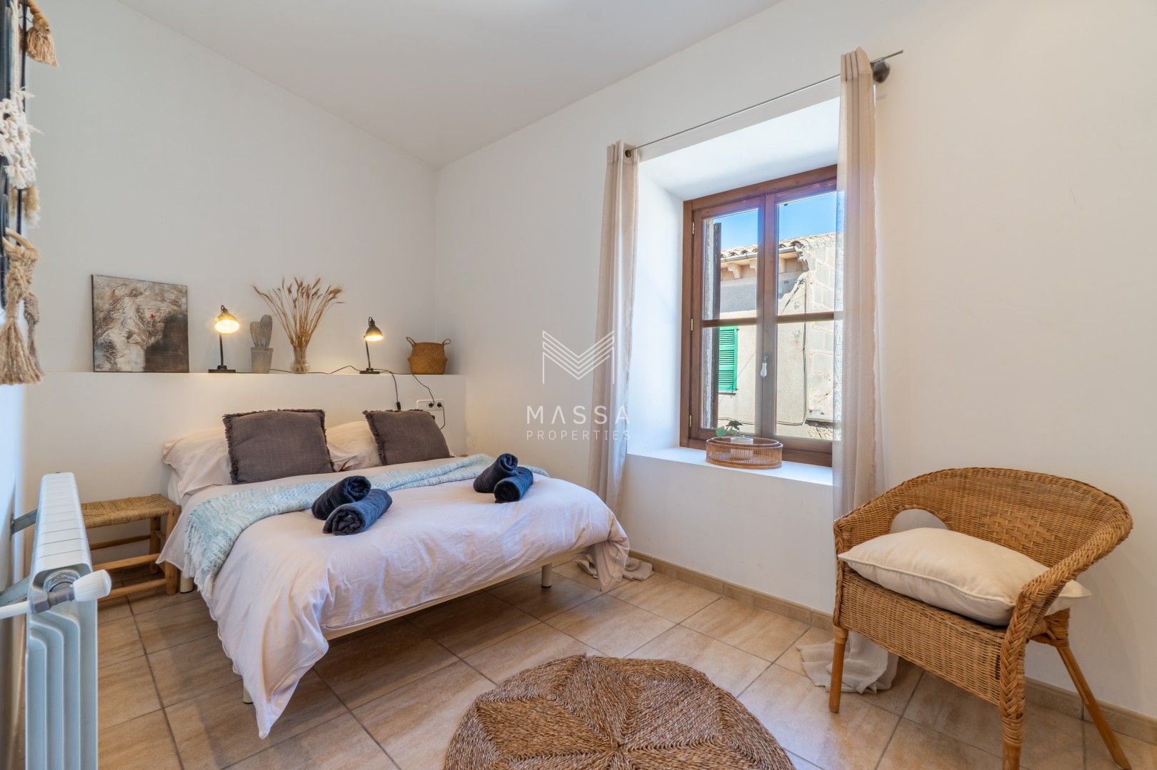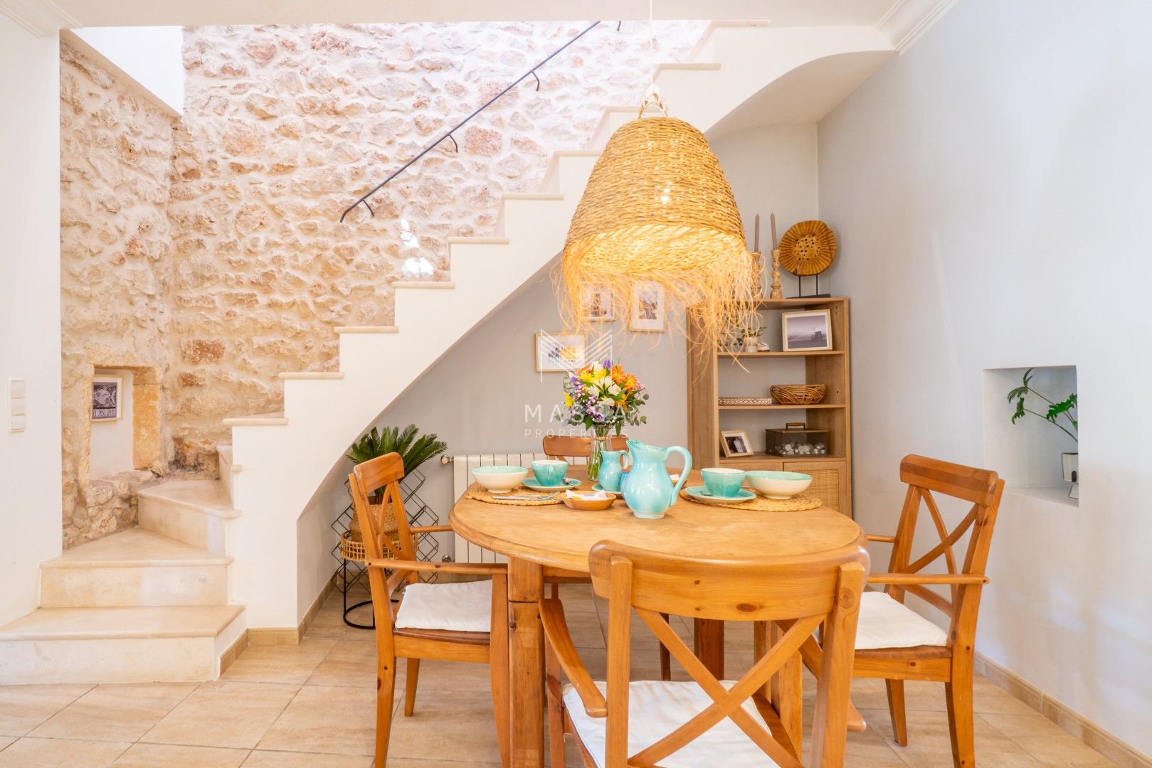 La decoración rinde homenaje al estilo tradicional mallorquín, con tonos claros, paredes de piedra arenisca y una armoniosa combinación de madera, mimbre y rafia, creando un ambiente cálido y relajado. La casa dispone de wifi y televisión de gran pantalla con todos los canales principales. La planta superior puede climatizarse bajo petición (con suplemento), y todas las estancias cuentan con ventiladores para garantizar el máximo confort durante su estancia.