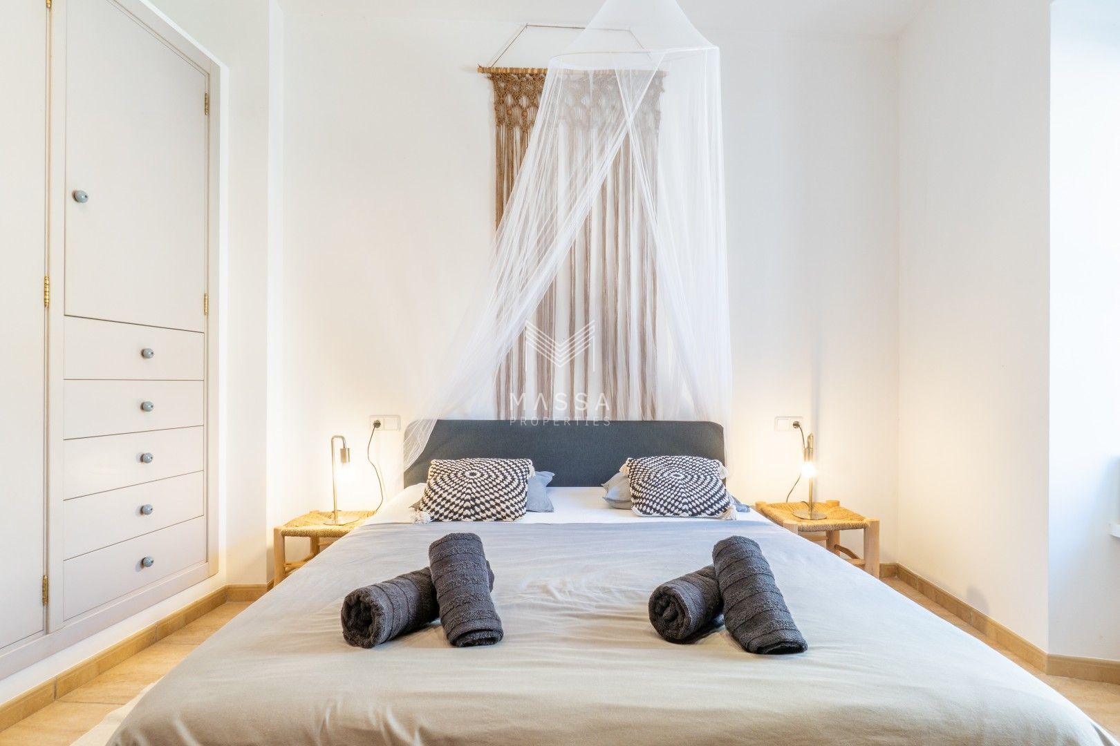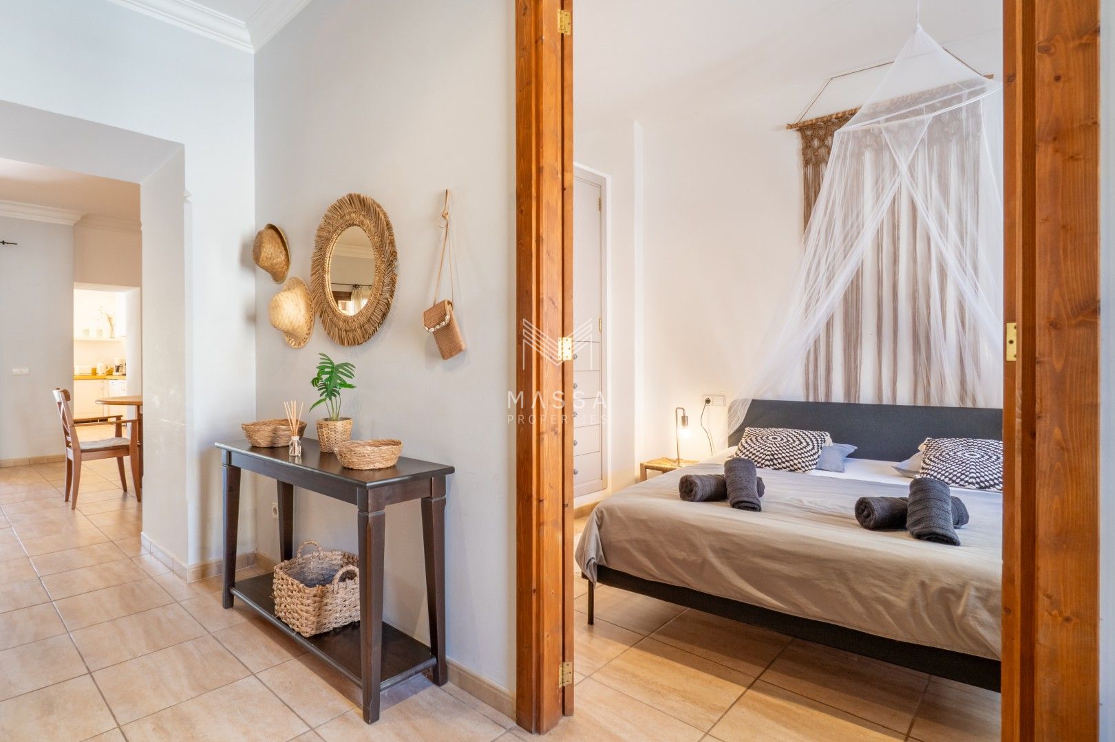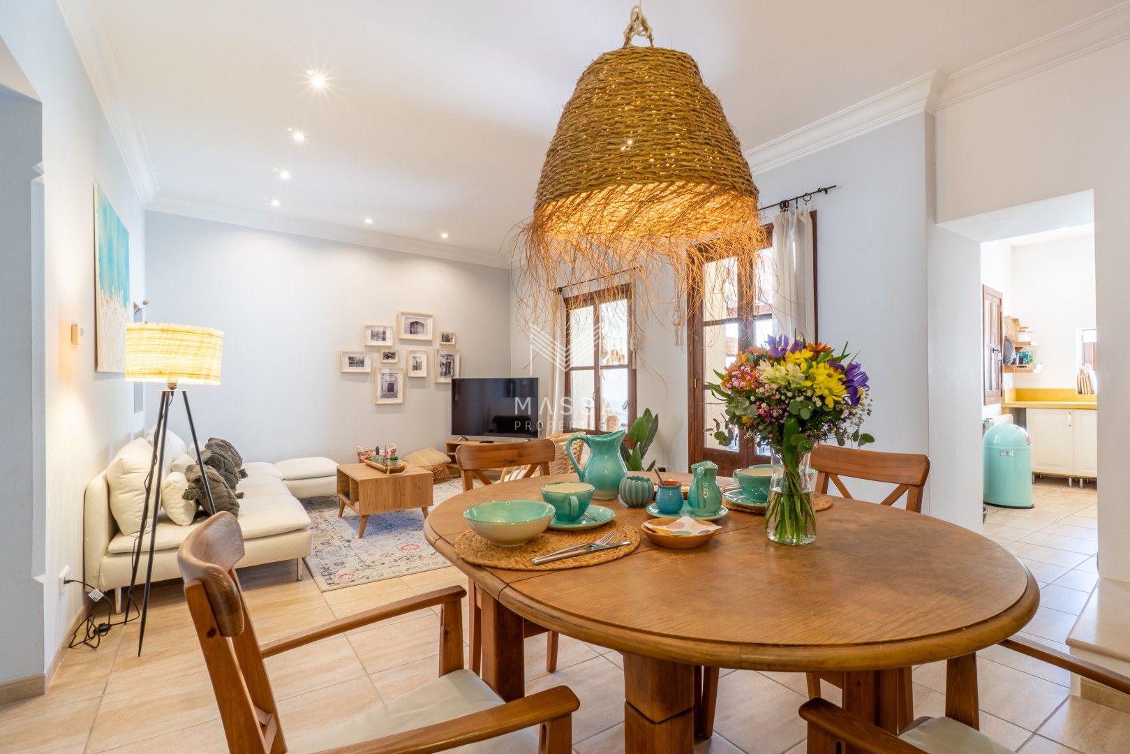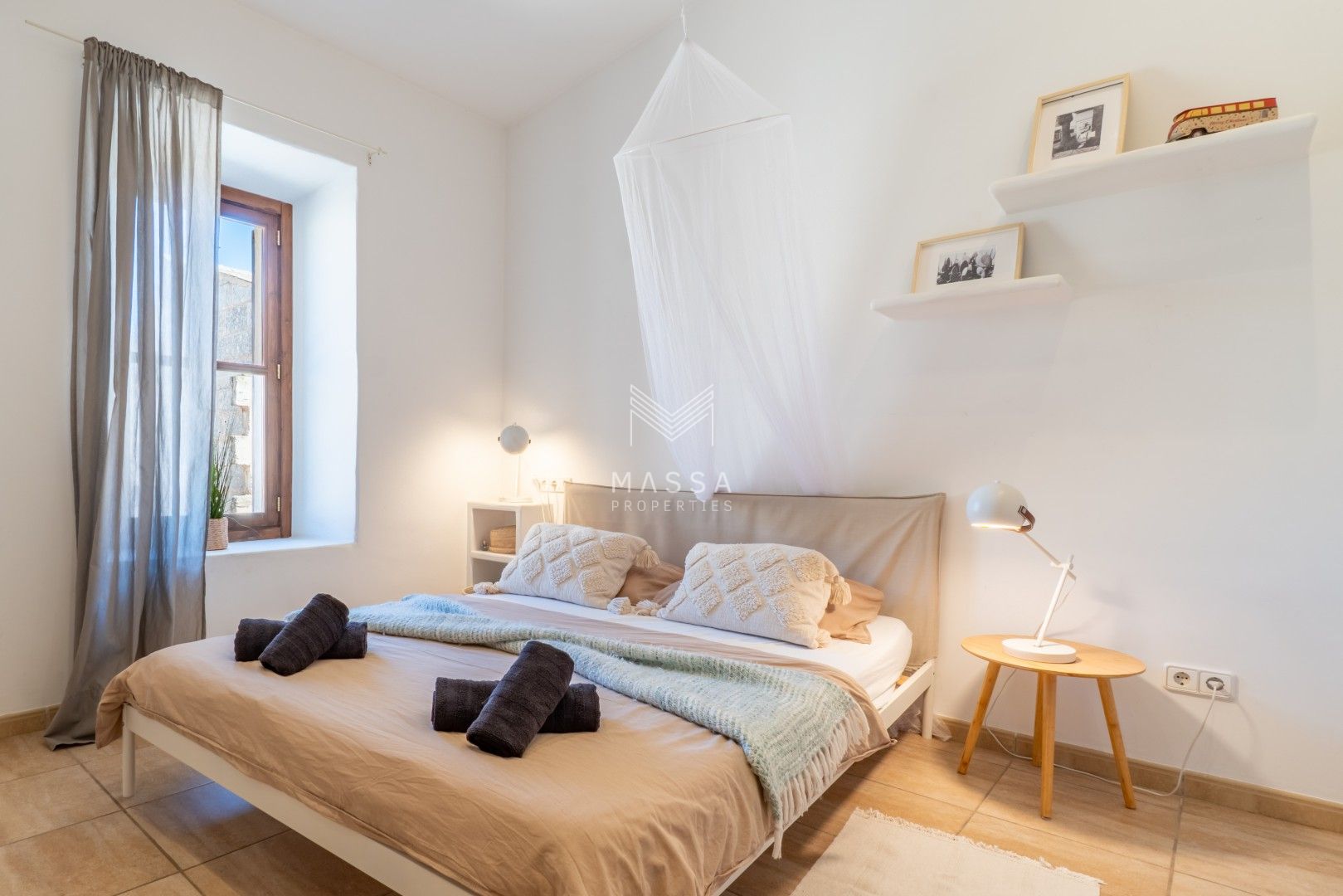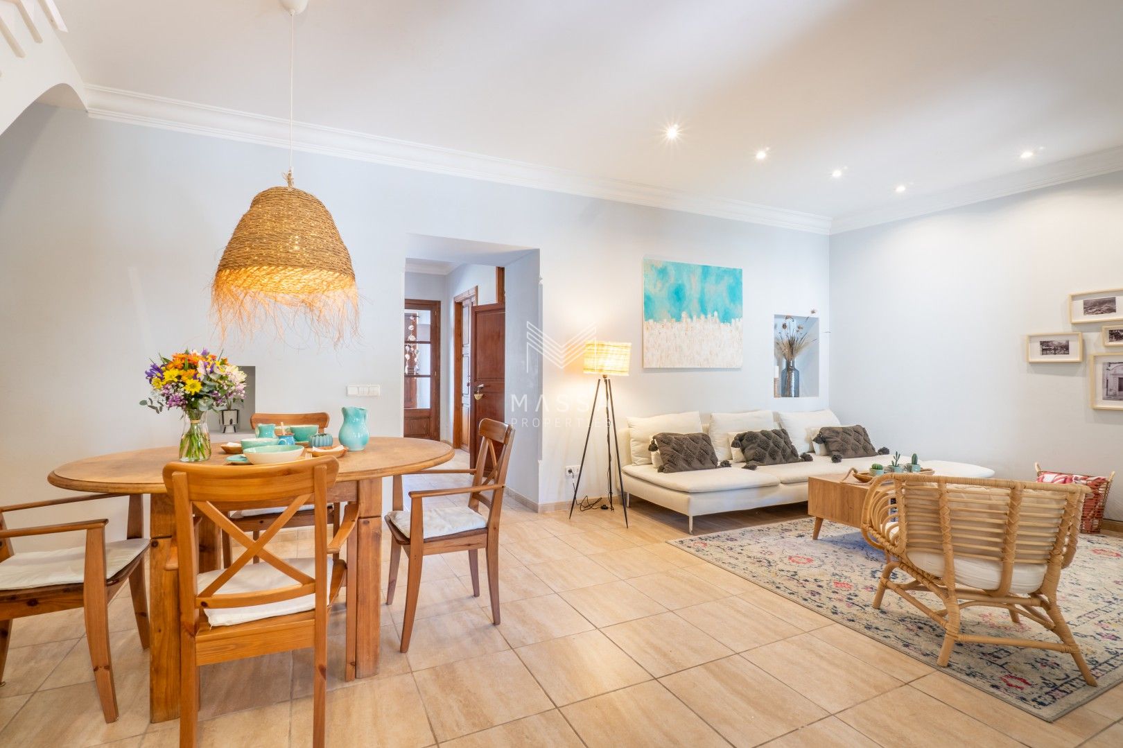 La decoración rinde homenaje al estilo tradicional mallorquín, con tonos claros, paredes de piedra arenisca y una armoniosa combinación de madera, mimbre y rafia, creando un ambiente cálido y relajado. La casa dispone de wifi y televisión de gran pantalla con todos los canales principales. La planta superior puede climatizarse bajo petición (con suplemento), y todas las estancias cuentan con ventiladores para garantizar el máximo confort durante su estancia.
