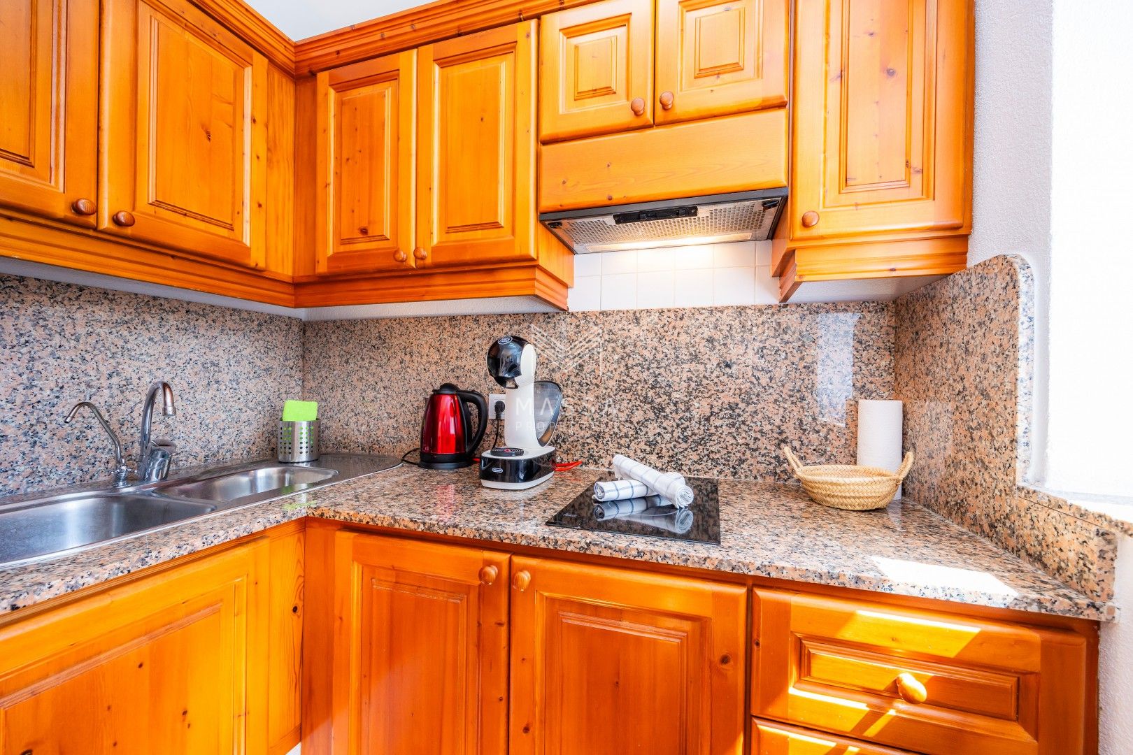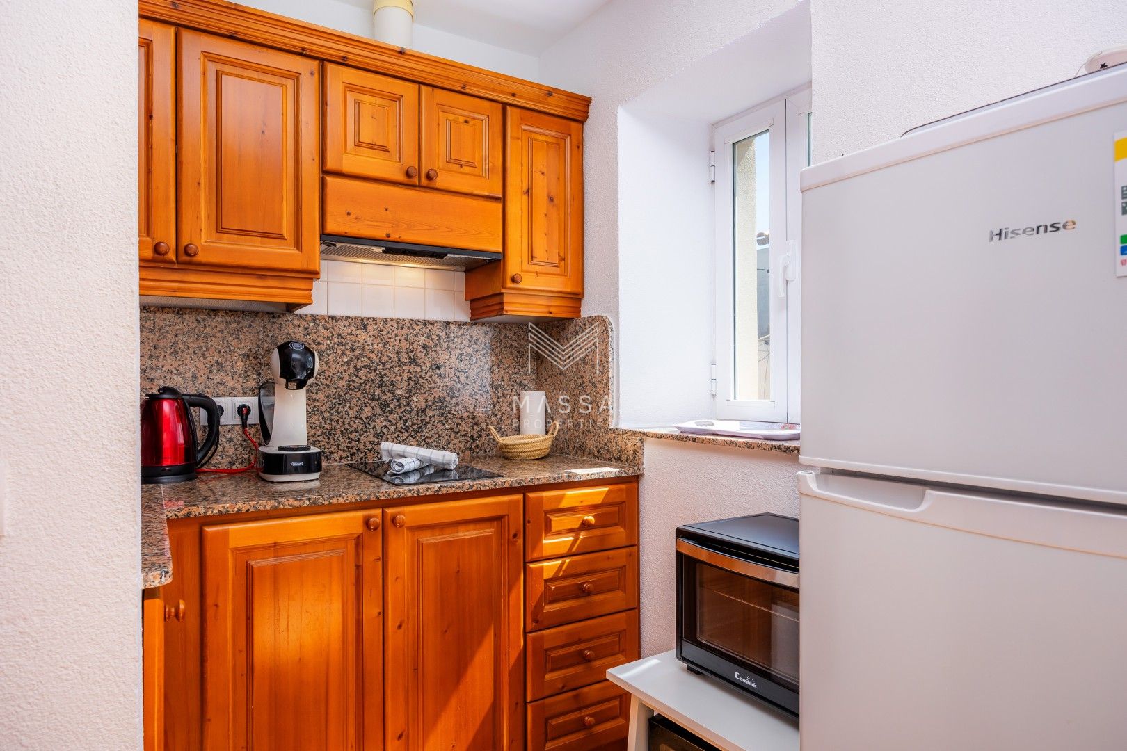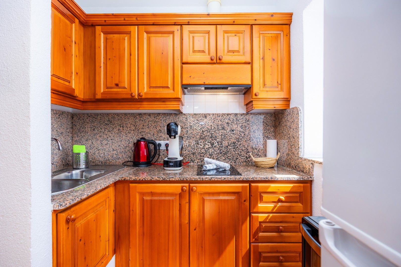 La cocina está completamente equipada con todo lo necesario para su comodidad, incluyendo una cafetera Dolce Gusto, un hervidor de agua y utensilios de cocina.