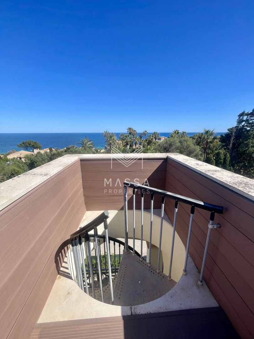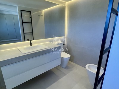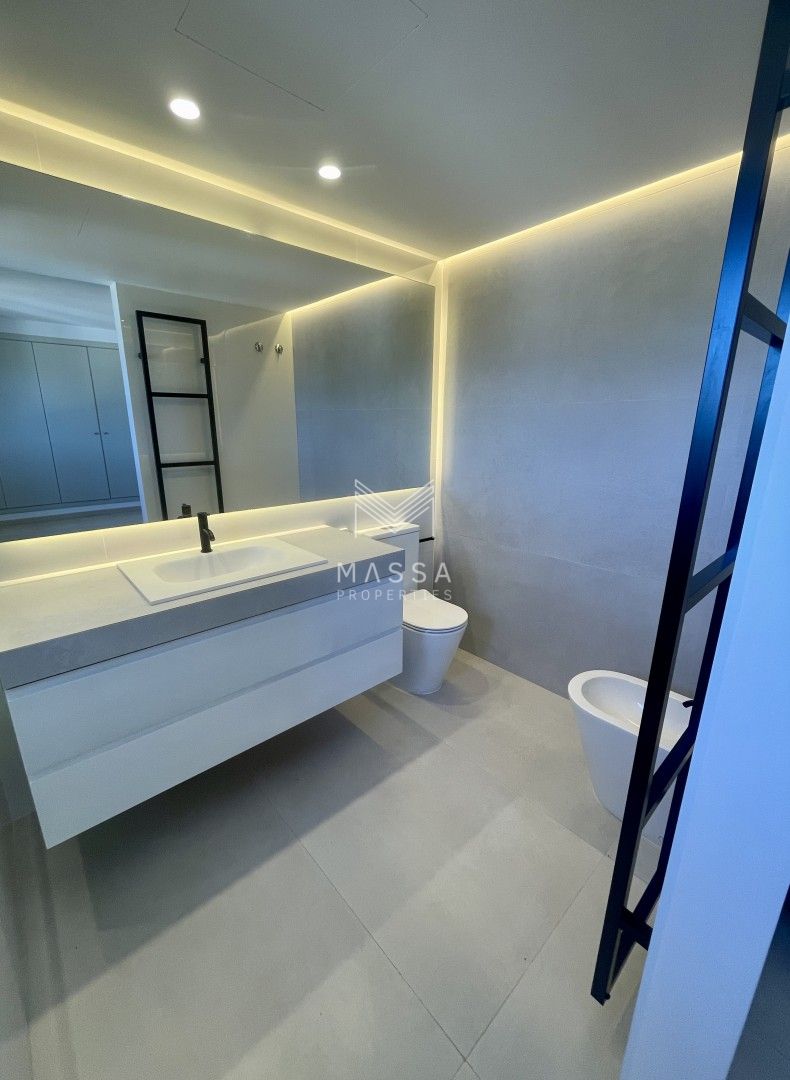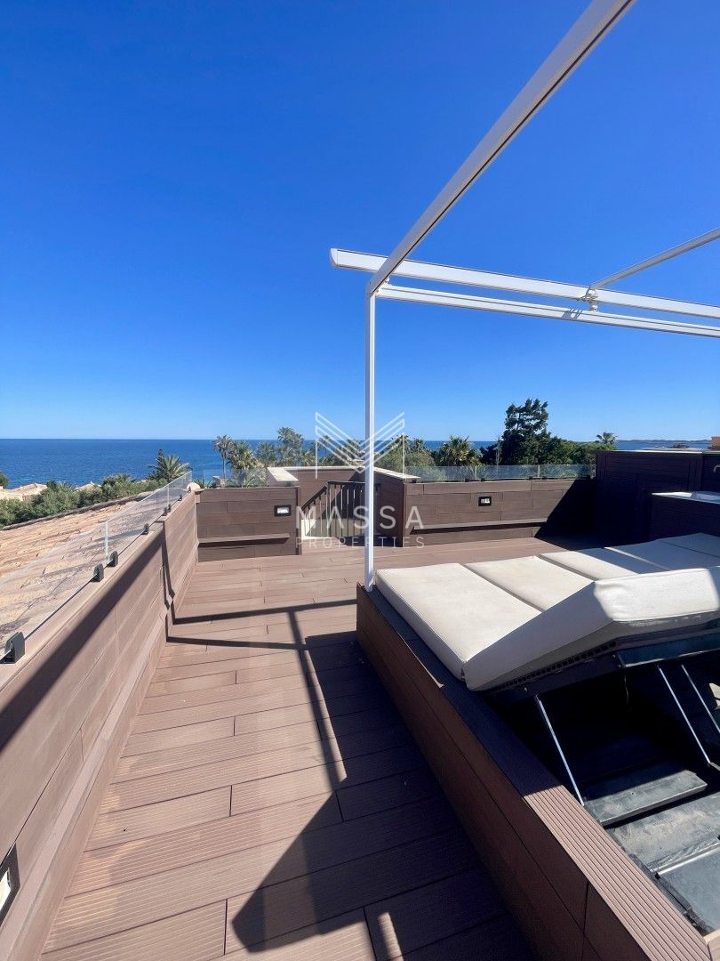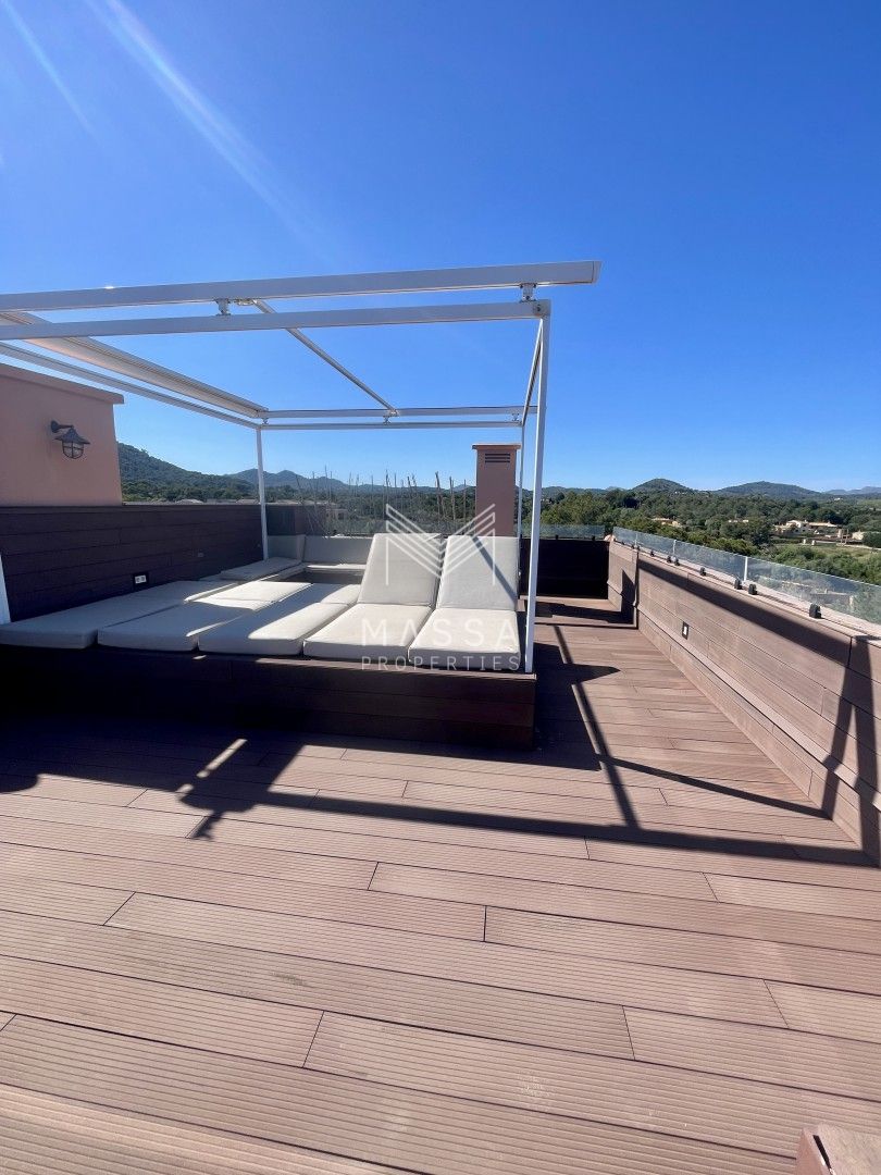 Desde el salón se accede a un amplio balcón con una gran mesa exterior, perfecto para disfrutar de comidas al aire libre. Desde este espacio, una elegante escalera de caracol conduce a la espectacular azotea privada, un auténtico oasis con zona de tumbonas y sofás, ideal para el descanso y el disfrute del clima mediterráneo en total privacidad.