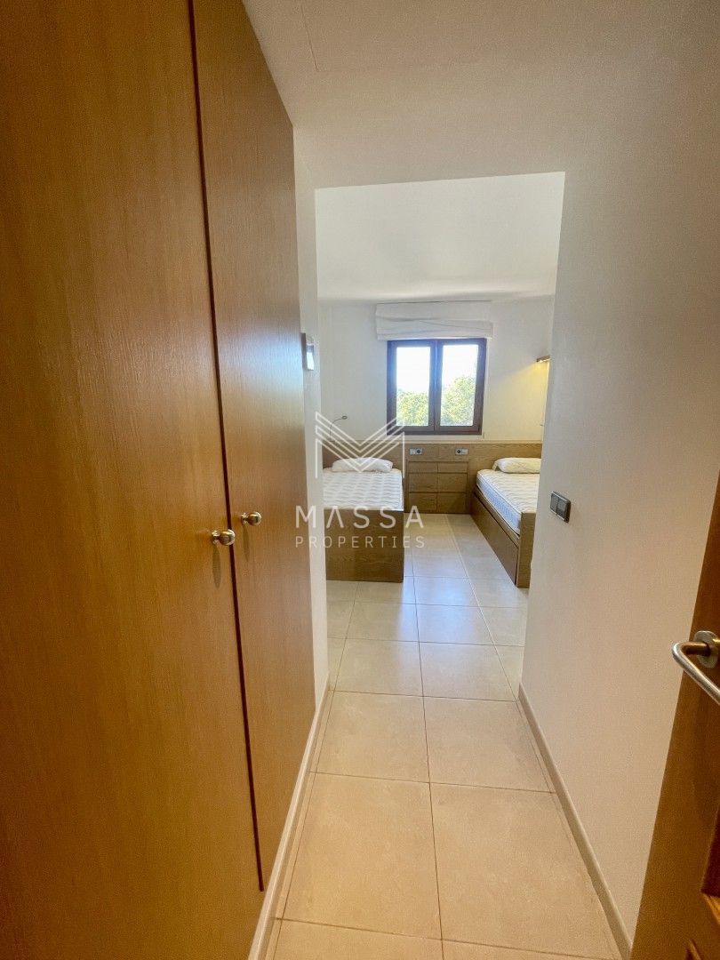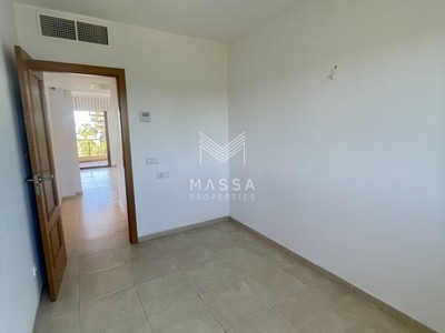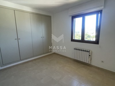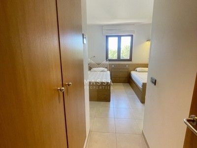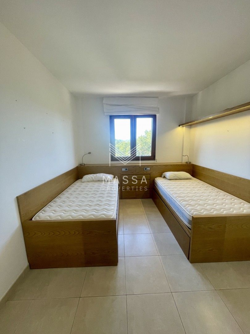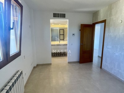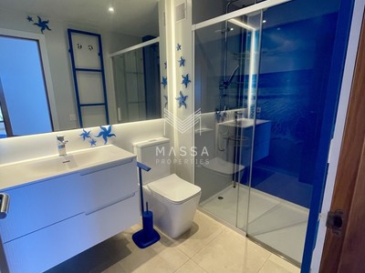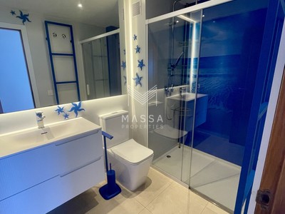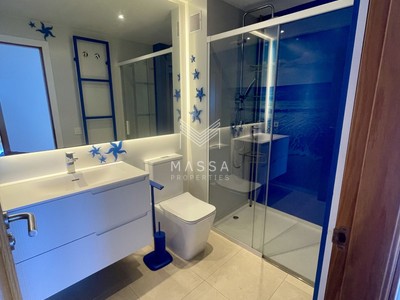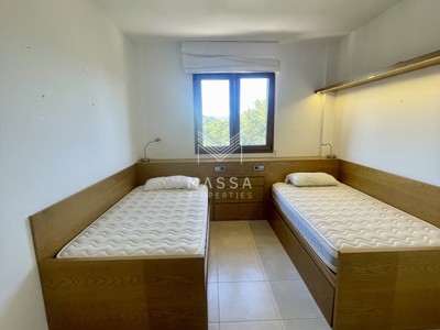 La vivienda se distribuye en tres habitaciones: una amplia suite principal con baño privado completo (ducha, bañera y bidet), una segunda habitación con dos camas individuales, y una tercera estancia polivalente ideal como despacho, vestidor o dormitorio. Completa la propiedad un segundo baño completo, amplios armarios empotrados, mobiliario de alta calidad y cámaras de seguridad.
