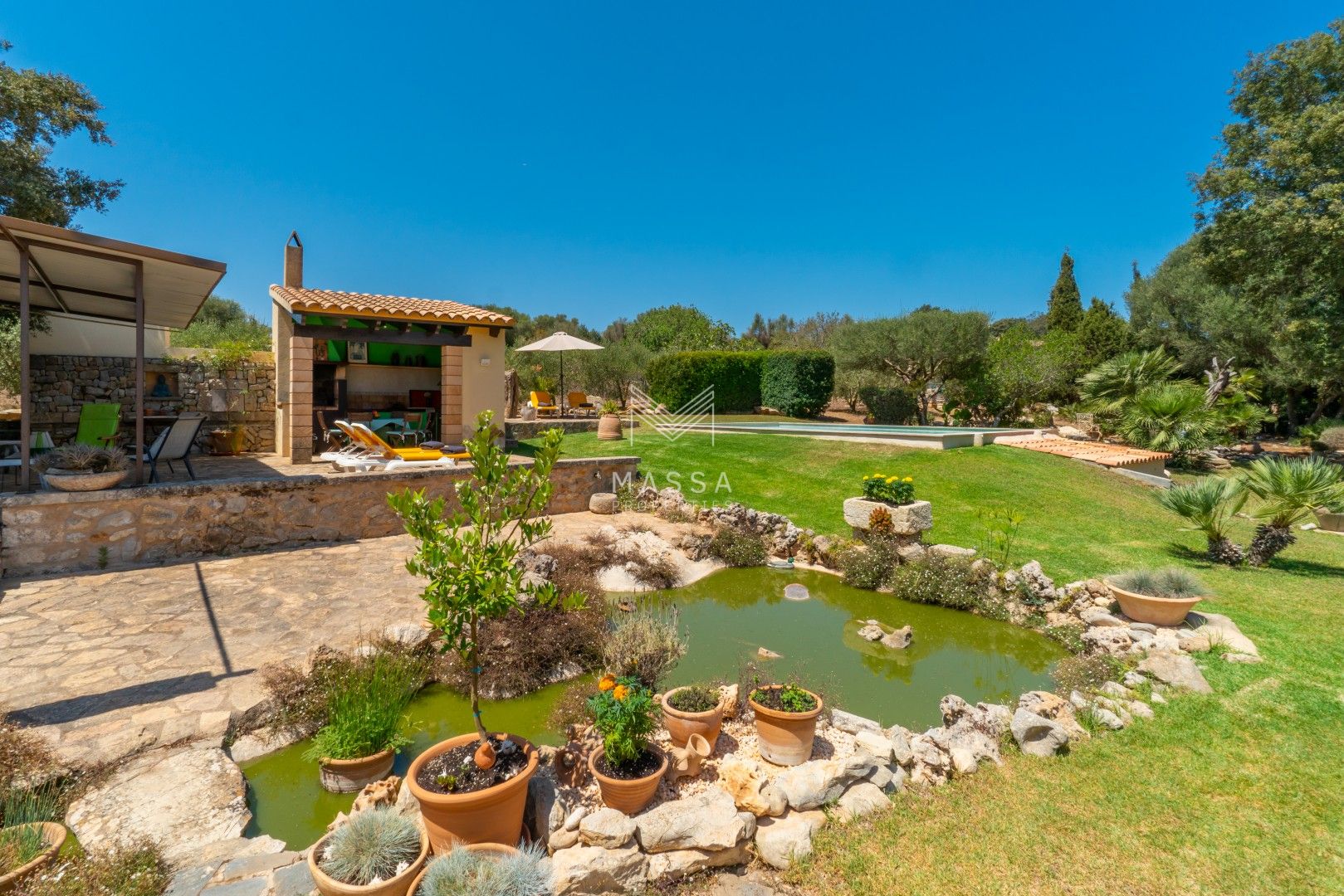 La finca está completamente vallada y ofrece una cuidada zona exterior con terrazas cubiertas y descubiertas, rodeadas de vegetación mediterránea. Dispone de varios espacios al aire libre pensados para el descanso, una mesa de comedor rústica para comidas al exterior y una piscina revestida con azulejos decorativos, que aporta un carácter especial a la propiedad. En el jardín, pequeños estanques con tortugas añaden un toque único y encantador al entorno.